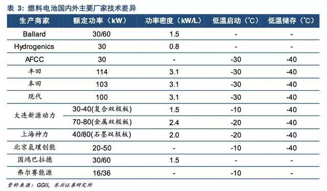 豐田Mirai的燃料電池電堆功率密度已經(jīng)達到3.1kW/L,較2008年的1.4kW/L提升了一倍。此外,國內(nèi)車用燃料電池系統(tǒng)功率密度也已經(jīng)達到2.0kW/L,并掌握了-10°C低溫啟動技術(shù)。