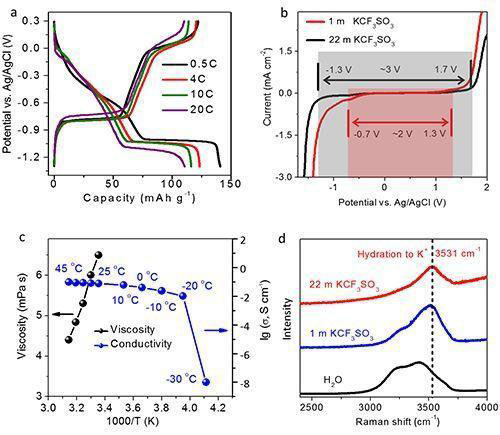 圖3.(a)有機負極PTCDI的電化學性能;(b-d)分別為22mol/L三氟甲基磺酸鉀電解液的性能的窗口(b)、粘度/電導率(c)和拉曼光譜圖(d)。