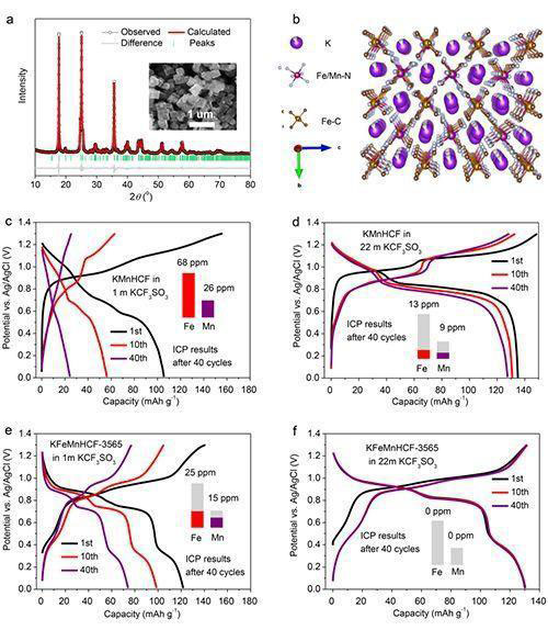 圖1. Fe取代富錳普魯士藍正極材料的結構與性能優(yōu)化。(a)Fe取代的KFeMnHCF-3565正極材料的XRD精修圖;(b)具有P21/n空間群的KxFeyMn1-y[Fe(CN)6]w·zH2O典型結構圖;(c-f)無取代材料(KMnHCF)和有Fe取代的材料(KFeMnHCF-3565)在1mol/L和22mol/L三氟甲基磺酸鉀電解液中的電化學以及過渡金屬溶解情況。