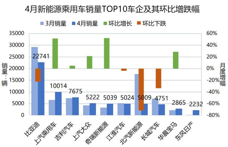國內(nèi)車市自去年一路震蕩下行,陷入低迷。而在今年4月份之前,新能源汽車市場盡管有些結(jié)構(gòu)性的調(diào)整,卻也保持了一路增長。然而,4月份的情況變了,新能源乘用車銷量環(huán)比減少了17.5%,同比增幅也大幅收窄至28.1%——這一情勢并不比繼續(xù)下行的傳統(tǒng)車市好多少。那么,4月下行的新能源乘用車市場發(fā)生了哪些微妙的變化?
