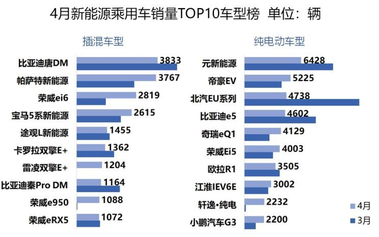 車型方面,比亞迪元新能源繼續(xù)穩(wěn)坐頭把交椅,但是6428輛的銷量較3月大幅減少了36%。出行消納能力強大的帝豪EV純電榜躍升至純電榜第二位,3月份它還在第4位。排在第三位的北汽EU系列銷售4738輛,較3月大幅減少64%,斬位在腰部還要靠下,是純電動車型TOP 10榜單中降幅最大的車型。