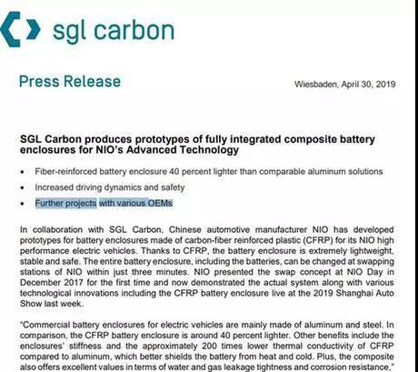 此前西格里碳素公司在其官網(wǎng)披露的與蔚來(lái)合作的聲明及其研發(fā)的動(dòng)力電池外殼樣品