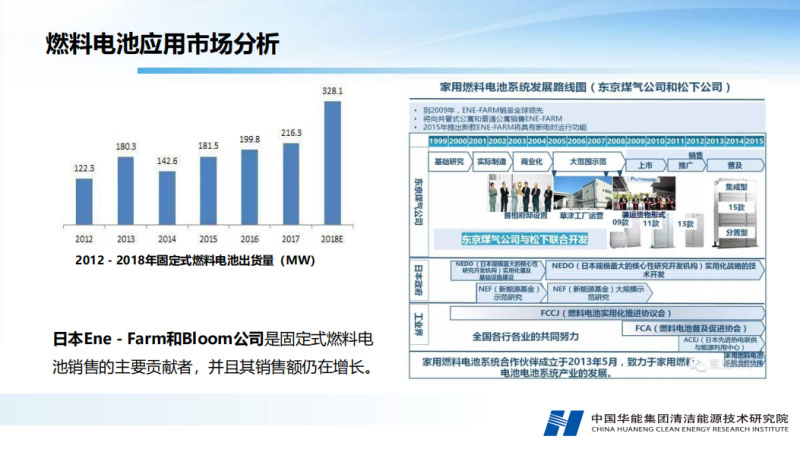下面我講一下燃料電池的應(yīng)用市場(chǎng)分析。談到能源革命首先是消費(fèi)和生產(chǎn)。能源革命首先需要技術(shù)的支持,我們需要合適的產(chǎn)品,才能進(jìn)行消費(fèi)的革命。分析一下2012-2018年國(guó)外的固定發(fā)電燃料電池市場(chǎng),固定式發(fā)電燃料電池銷量保持持續(xù)增長(zhǎng)。固體氧化物占了很大的比例,已經(jīng)超過了熔融碳酸鹽的比例。為什么?因?yàn)閲?guó)外有日本的ene-Farm計(jì)劃和美國(guó)Bloom energy公司的推動(dòng)。首先看日本的ENE-farm計(jì)劃,固體氧化物燃料電池家用熱電聯(lián)產(chǎn)系統(tǒng)的價(jià)格是大幅度下降的。單個(gè)系統(tǒng)功率700瓦的家用系統(tǒng)2005年的價(jià)格是40萬人民幣,成本非常高。到目前推廣銷售了25萬臺(tái),價(jià)格降低到了8萬人民幣。它的最終目標(biāo)是要降到三萬元每臺(tái)。日本的ENE-Farm計(jì)劃通過產(chǎn)業(yè)化,降低成本是非常迅速的,成本降低了90%。這就說明燃料電池只有產(chǎn)業(yè)化和示范應(yīng)用才能降低它的成本。另外,固體氧化物燃料電池在歐洲和德國(guó)也進(jìn)行了示范應(yīng)用銷售了1500套,基本采用的是日本的技術(shù),但是它的示范應(yīng)用沒有日本的力度大。德國(guó)也有計(jì)劃來進(jìn)行這樣的示范。