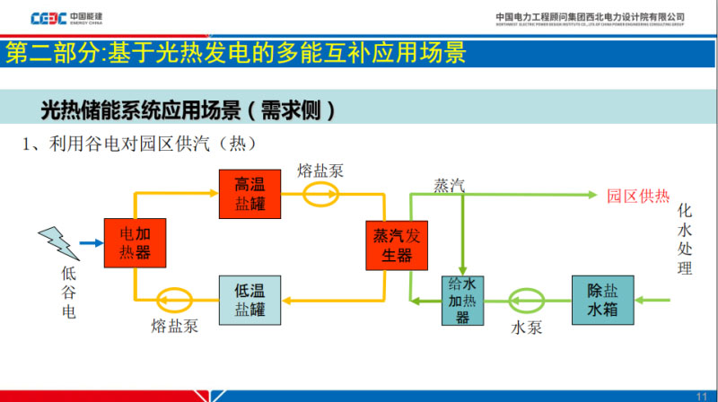 第二個(gè)部分介紹一些具體的應(yīng)用場(chǎng)景,通過電加熱器,再加上把這個(gè)熔融鹽從低溫加熱到高溫,再通過容顏崩需要能量的時(shí)候再循環(huán),就是高溫熔融鹽的熱量轉(zhuǎn)換成水或者蒸汽的熱量,以供這個(gè)工業(yè)用氣或者用熱。有一個(gè)效率的問題,我們知道熱的效率基本上百分之百的,這樣的利率方式熱再供熱效率比較可觀的,如果不考慮散熱的話,基本上百分之百的。這個(gè)天然氣的燃機(jī)余熱煙氣建設(shè)一臺(tái)熔融鹽余熱波爐,也可以實(shí)現(xiàn)上一個(gè)場(chǎng)景有類似的問題。因?yàn)槲覀兡莻€(gè)燃機(jī)負(fù)荷的需求特性隨著時(shí)間不是那么穩(wěn)定,為了高效的利用能源我希望這個(gè)天然氣的利用這一側(cè)比較好的在它的高效點(diǎn)工作。匹配負(fù)荷需求的時(shí)候,用儲(chǔ)熱系統(tǒng)存儲(chǔ)起來。