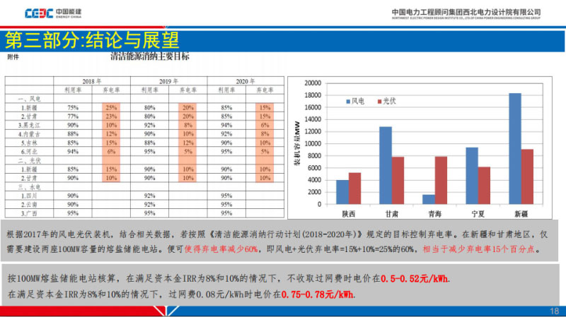 結(jié)論與展望,再來回顧一下前面幾張PPT提到的目標(biāo),2018年,2019年這些省份,根據(jù)2017年的裝機(jī),按照這個(gè)計(jì)劃目標(biāo)來講,在新疆和甘肅地區(qū),這兩個(gè)地區(qū)對(duì)它的電網(wǎng)裝機(jī)還有電力生產(chǎn)的特性比較熟悉,在新疆還有甘肅地區(qū)僅需要建設(shè)兩座一百兆瓦的熔融鹽儲(chǔ)能電站,配置的儲(chǔ)熱時(shí)間大概是10到12小時(shí),便可以使得氣電率減少60%,風(fēng)電加光伏的氣電率,減少氣電率15個(gè)百分點(diǎn)。大約是投資60億這個(gè)水平。再?gòu)?qiáng)調(diào)一下它的壽命應(yīng)該是很可靠的,25年應(yīng)該沒有問題的。同時(shí)做了一個(gè)簡(jiǎn)單的財(cái)務(wù)測(cè)算,資本經(jīng)10%還有8%的前提下不收取過往費(fèi)時(shí),我這個(gè)就是回收氣電發(fā)出來的是5毛錢到5毛2每度,這里面一個(gè)背景跟剛剛談到的效率有關(guān)系,過往費(fèi)是這樣盈利的很脆弱的條件。