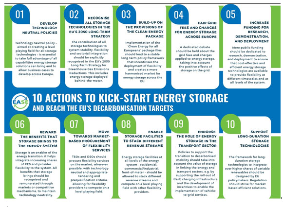根據(jù)歐盟描述的“2050年的脫碳場(chǎng)景”(到2050年與1990年的水平相比減少80%,到2050年減少凈零排放),2050年,歐洲電力系統(tǒng)固定儲(chǔ)能容量可能高達(dá)450TWh。包括公用事業(yè)公司、技術(shù)供應(yīng)商以及配電和輸電網(wǎng)絡(luò)運(yùn)營(yíng)商在內(nèi)的歐洲儲(chǔ)能協(xié)會(huì)(EASE)發(fā)布了其“啟動(dòng)”儲(chǔ)能10個(gè)建議,并通過(guò)歐洲最常用的七種語(yǔ)言對(duì)外發(fā)布。