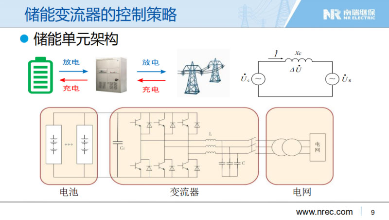 第二部分,介紹一下儲能有這么多好處,沒有實現(xiàn),但是有很多工作可以做。從技術(shù)方面還有哪些工作可以做呢?儲能變流器首先有自身的控制策略,儲能有整個系統(tǒng)的控制模式。先看看儲能變流器本身有哪些控制策略。第一個是儲能單元架構(gòu),大家都很清楚。這可以等效于右上角的模型,它跟電網(wǎng)之間通過連接阻抗聯(lián)系在一起。儲能系統(tǒng)與電網(wǎng)交換的有功和無功功率見表達式,這個表達式里面電網(wǎng)的電壓幅值Us,儲能作為電源的幅值是Uc,兩個電壓相量的夾角δ,也稱為功角。通過調(diào)節(jié)變流器輸出的Uc和δ值,可以實現(xiàn)變流器輸出的有功和無功雙向可控,它在四象限可以運行,調(diào)節(jié)性能非常優(yōu)秀,充分發(fā)揮儲能的調(diào)節(jié)性能。具體如何實現(xiàn)這樣的調(diào)節(jié)?右下角的圖,Uc是怎么來的,Uc是控制出來的。變流器在PWM載波控制下,其輸出幅值及與系統(tǒng)電壓的相位是由控制系統(tǒng)調(diào)節(jié)計算得到的調(diào)制波決定的。請看控制框圖,最左邊Xd*是某一個被控目標值的給定值,Xd是被控目標的測量值,當閉環(huán)控制系統(tǒng)達到穩(wěn)定平衡的時候,Xd*就等于Xd,同樣的另外一個維度,Xq*就等于Xq。假如把目標值設(shè)定成有功功率和無功功率,那么控制系統(tǒng)穩(wěn)定時,儲能系統(tǒng)輸出的有功功率就會等于有功功率給定值,無功功率也等于無功功率的給定值,這時的控制就稱為PQ模式。當Xd和Xq分別為頻率和電壓時,這時的控制就稱為VF模式這是變流器的一種控制策略。