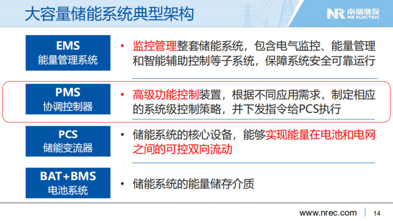 有了變流器控制策略以后,把它用到大容量儲能系統(tǒng)里面,儲能系統(tǒng)有哪些控制模式呢?第一,以一次調(diào)頻一次調(diào)壓模式運行是可以的。還有二次調(diào)頻二次調(diào)壓,就是PQ模式。離網(wǎng)的時候可以恒頻恒壓,還有可以PQ模式。作為一個儲能系統(tǒng),頂層是EMS加PMS,功能強大,系統(tǒng)就很好。大容量儲能系統(tǒng)比如100MW系統(tǒng),按目前的一個PCS功率500KW考慮,就要兩百臺的PCS。并網(wǎng)運行如果參與電網(wǎng)的調(diào)節(jié),需要大家行為一致,才能對系統(tǒng)做最好的貢獻,但要求200臺PCS行為一致是不可能的,個體存在的微小偏差,在動態(tài)過程中相互作用,可能會放大并對最終結(jié)果產(chǎn)生較大影響,甚至不能達到系統(tǒng)控制的要求。我們的解決方案是在PCS之上增加一個控制設(shè)備,叫PMS協(xié)調(diào)控制器。協(xié)調(diào)控制器可以根據(jù)需要配置多臺,形成中間控制層,這就構(gòu)成了一個EMS+PMS+PCS的三層次控制管理架構(gòu)。有什么好處呢?高級控制功能可以放在中間層來做,根據(jù)不同應(yīng)用要求可以定制系統(tǒng)控制策略。中間層根據(jù)高級應(yīng)用策略進行控制計算,計算結(jié)果出來之后平均分給各個PCS執(zhí)行。這樣PCS的輸出一致性就會非常好,不會有很多偏差,總的控制效果就會很好。