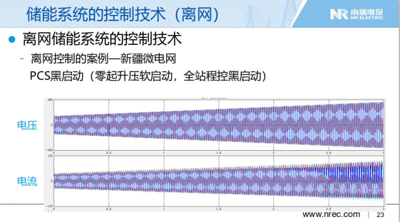 離網(wǎng)方面,儲能系統(tǒng)作用更大。在離網(wǎng)模式下,整個系統(tǒng)慣量比較小,常常用虛擬同步機模式運行,也可以V/F模式運行。離網(wǎng)儲能系統(tǒng)的控制,實現(xiàn)離網(wǎng)系統(tǒng)多VSG并聯(lián)穩(wěn)定運行的技術(shù)。我們提出一些自有的技術(shù),比如說自校正的轉(zhuǎn)子運動方程優(yōu)化控制等。下面不詳細講。離網(wǎng)儲能系統(tǒng)也有一個案例,新疆微電網(wǎng)。我們實現(xiàn)32臺PCS虛擬同步機模式并聯(lián),作為主電源支撐整個微電網(wǎng)的電壓和頻率穩(wěn)定。左邊是監(jiān)控,中間是現(xiàn)場照片。儲能變流器承受變壓器直接沖擊,系統(tǒng)電壓、頻率平穩(wěn)過渡。整個系統(tǒng)黑了以后,實現(xiàn)自動邏輯的PCS黑啟動。