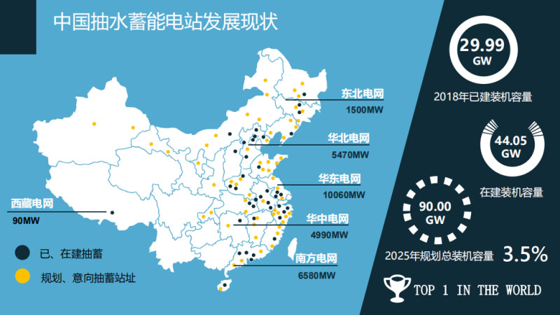 第二個(gè),抽水蓄能電站這一塊,我們選擇比較合適的地形,建一個(gè)上水庫、下水庫,高峰的時(shí)候把上水庫的水發(fā)到下水庫來,發(fā)電原理比較簡單。右邊是已建的一些抽水蓄能電站的工程圖片。中間那張有上水庫和下水庫的就是浙江省在安吉的天荒坪抽水蓄能電站,也是我們?nèi)A東地區(qū)已建的最大一個(gè)抽水蓄能電站。抽水蓄能電站在全世界范圍以內(nèi)最早發(fā)源于瑞士,那是1882年。歐洲發(fā)展之后迅速轉(zhuǎn)到美國和日本。近十年建設(shè)的重心轉(zhuǎn)到了亞洲,尤其是中國。到目前為止,全球的抽水蓄能電站總裝機(jī)達(dá)到167GW。全球裝機(jī)比重層面來看,2016年的數(shù)據(jù),抽水蓄能裝機(jī)比重達(dá)到全球總裝機(jī)的2.4%。中國2018年底已建的抽水蓄能電站是30GW,占的比重是1.6%左右,大概是這么一個(gè)規(guī)模。相比世界水平來講,目前抽水蓄能電站的比重還是略顯低一點(diǎn),還有很大的發(fā)展空間。當(dāng)然,這也不僅僅直接是一個(gè)裝機(jī)容量的配比關(guān)系。中國的發(fā)展情況目前主要集中在沿海的發(fā)達(dá)地區(qū)像華東、華北,另外還有東北、華中地區(qū)。目前2018年底建成了30GW,在建44GW。規(guī)劃到2025年,是90GW,占總裝機(jī)規(guī)模3.5%左右。截至2018年底,中國建成的抽水蓄能電站總裝機(jī)規(guī)模在世界上排列第一。