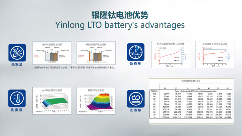 鈦酸鋰的技術(shù)優(yōu)勢我想各位專家領(lǐng)導(dǎo)也比較了解。它的四大優(yōu)勢,它卓越的安全性能、高倍率快速充放性能還有耐寬溫以及長壽命。這邊可以著重看一下長壽命,這有一個鈦酸鋰電池的壽命表,在不同的溫度和DOD的充放電狀態(tài)下的充電次數(shù)。舉一個例子,一個在30攝氏度50%DOD有將近八萬次的充電壽命。這么多的四大鈦酸鋰的技術(shù)優(yōu)勢,它的原因在哪里。這個秘密在于我們的濕法納米材料工藝。通過三個方面決定了鈦酸鋰的技術(shù)優(yōu)勢。第一個就是納米鈦酸鋰材料相對于石墨負(fù)極來說是一個穩(wěn)定的三維晶體結(jié)構(gòu)。負(fù)極不容易遭到破壞尤其高倍率和高低溫的狀態(tài)下不會造成不可逆的結(jié)構(gòu)的破壞,從而保證了倍率以及寬溫以及壽命性能。