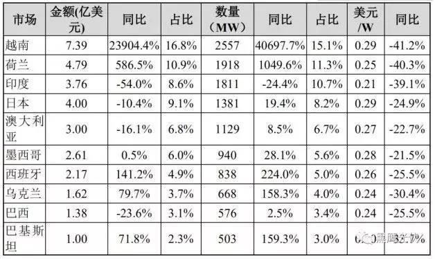 《2019年一季度我國光伏產(chǎn)品進(jìn)出口分析》今年一季度,受國內(nèi)光伏組件價(jià)格快速下降影響,海外新興市場需求旺盛,中國組件產(chǎn)品出口至186個(gè)國家和地區(qū),組件出口額同比增長31.89%至43.9億美元;出口量同比大增77.63%至16.78GW。