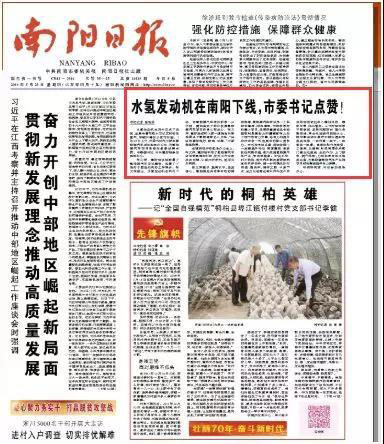 5月23日,南陽(yáng)日?qǐng)?bào)頭版發(fā)文《水制氫發(fā)動(dòng)機(jī)正式下線,市委書(shū)記點(diǎn)贊!》,文章稱,水制氫發(fā)動(dòng)機(jī)在我市正式下線了,這意味著車(chē)載水可以實(shí)時(shí)制取氫氣,車(chē)輛只需加水即可行駛。