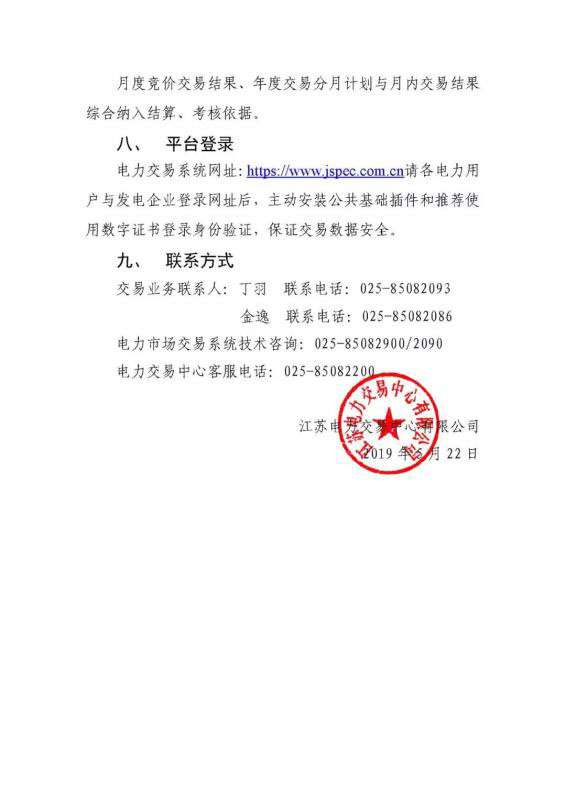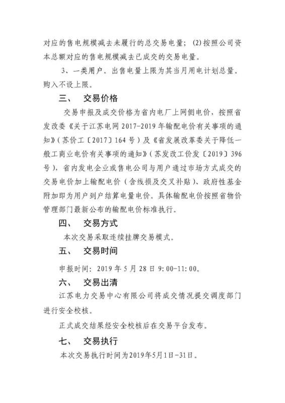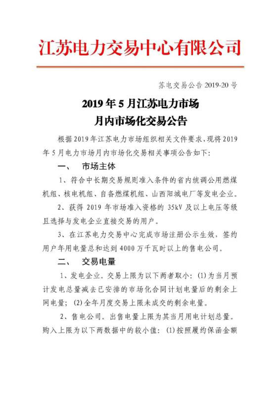 2019年5月江蘇電力市場(chǎng)月內(nèi)市場(chǎng)化交易公告