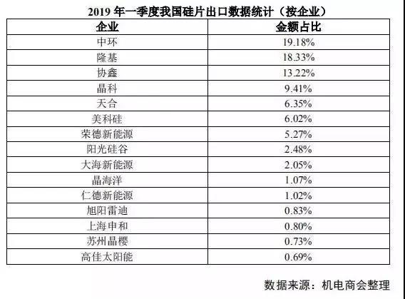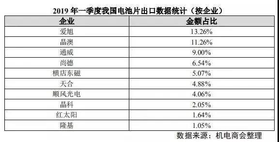 從出口企業(yè)看,2019 年一季度我國組件出口額前五位企業(yè)分別是晶科、晶澳、天合、阿特斯和隆基,前十二位企業(yè)出口數(shù)量占總出口量的 65%以上。(來源:中國機電產(chǎn)品進出口商會)