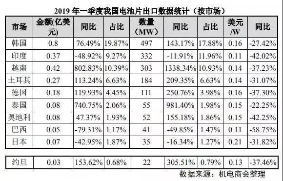 從出口市場看,2019 年一季度我國電池片出口前五位市場分別是韓國、印度、越南、土耳其和德國。韓國取代印度成為我國電池片出口第一大市場,對韓國出口電池片金額 0.8 億美元,占總出口額的 19.87%;對韓國電池片出口數(shù)量為497MW,占比 17.88%。
