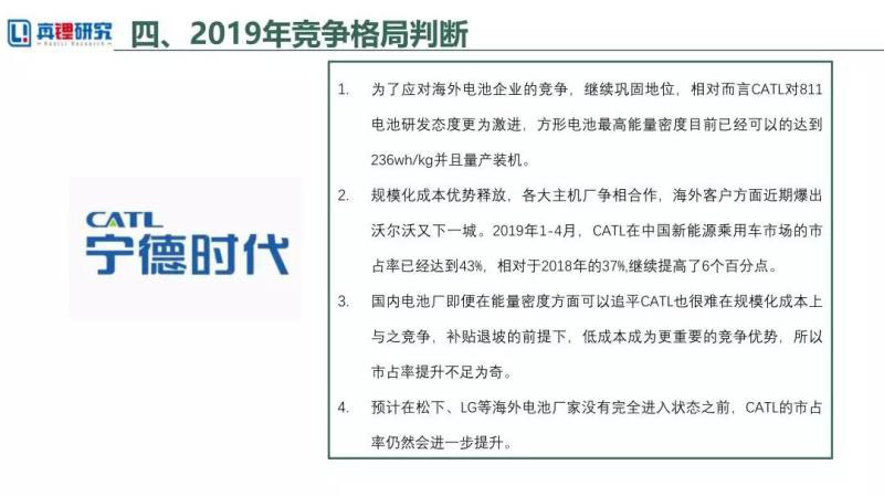 規(guī)?;杀緝?yōu)勢(shì)釋放,各大主機(jī)廠爭(zhēng)相合作,海外客戶方面近期爆出沃爾沃又下一城。2019年1-4月,CATL在中國新能源乘用車市場(chǎng)的市占率已經(jīng)達(dá)到43%,相對(duì)于2018年的37%,繼續(xù)提高了6個(gè)百分點(diǎn)。