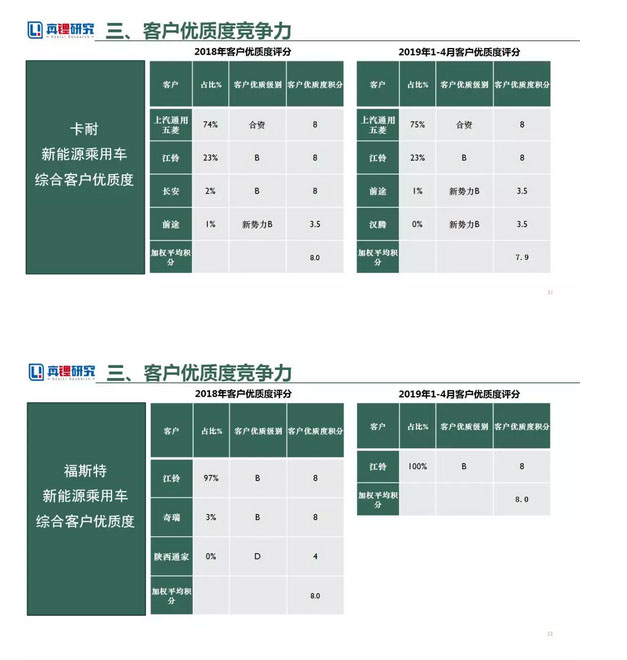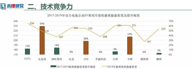 2017年以來補(bǔ)貼和能量密度掛鉤,刺激了企業(yè)的研發(fā)速度。2017-2019年1-4月能量密度提升前三甲分別是比亞迪提升59%,卡耐提升37%,萬向提升28%。