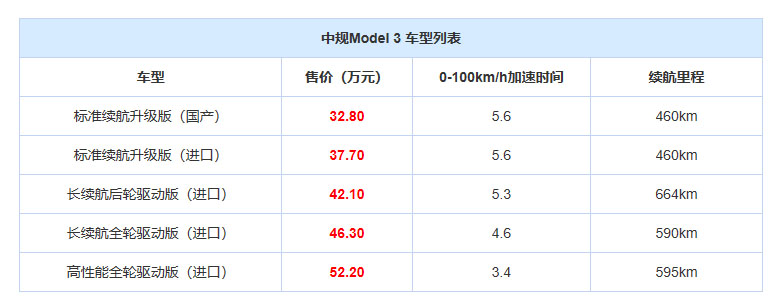 2019年5月31日,國產(chǎn)Model 3標準續(xù)航升級版車型開放預訂,同時起售價格也正式公布,為32.80萬元。新車是目前進口Model 3入門車型(標準續(xù)航升級版)的國產(chǎn)版本,配備60kWh容量電池組,擁有460km的工信部續(xù)航里程,0-100km/h加速時間為5.6秒,而預計交付時間為6-10個月。