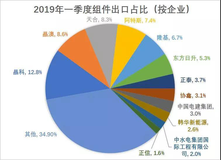 從海關(guān)數(shù)據(jù)來看,受國內(nèi)光伏組件價格快速下降影響,海外新興市場需求旺盛,企業(yè)加大出口力度。2018年我國組件出口量約41GW,同比增長30%;2019年一季度各月組件出口數(shù)量均大幅增長,總出口量達16.78GW,同比大幅增長77.63%。從出口企業(yè)看,2019年一季度我國組件出口額前十二位企業(yè)出口數(shù)量占總出口量的65%以上。