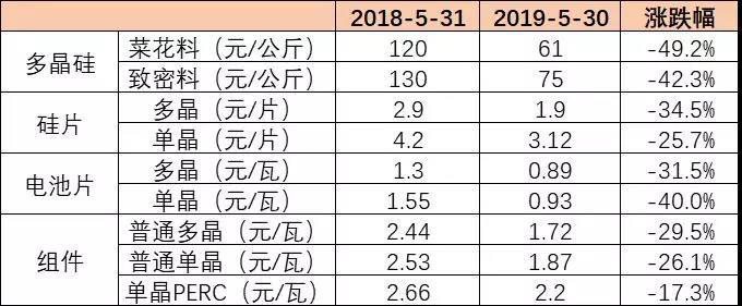 而從531發(fā)布之后一整年的價格來看則更為明顯,即使是價格較為堅挺的單晶PERC組件,跌幅也達到了17.3%,而其他環(huán)節(jié)跌幅更加劇烈,其中硅料環(huán)節(jié)由于531影響以及今年一季度新產(chǎn)能大幅投產(chǎn),價格跌幅將近一半。