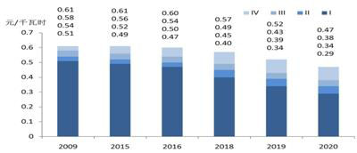 確定陸上風(fēng)電補貼完全退出時間表。2019年陸上風(fēng)電指導(dǎo)價標準為每千瓦時0.34、0.39、0.43、0.52元。2020年為每千瓦時0.29、0.34、0.38、0.47元,指導(dǎo)價低于當?shù)厝济簶藯U電價(含脫硫、脫硝、除塵)的地區(qū),以燃煤標桿電價作為指導(dǎo)價(圖3)。2021年新核準陸上風(fēng)電項目全面實現(xiàn)平價上網(wǎng),國家不再補貼。