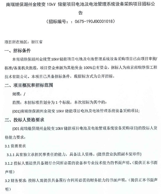 中國(guó)儲(chǔ)能網(wǎng)訊:近日,浙江湖州金陵變10kV儲(chǔ)能項(xiàng)目開啟招標(biāo),公告顯示招標(biāo)人為南瑞繼保工程技術(shù)有限公司,招標(biāo)范圍包含儲(chǔ)能電池及電池管理系統(tǒng)設(shè)備采購(gòu)。要求投標(biāo)人3年內(nèi)有電網(wǎng)側(cè)儲(chǔ)能應(yīng)用業(yè)績(jī)。