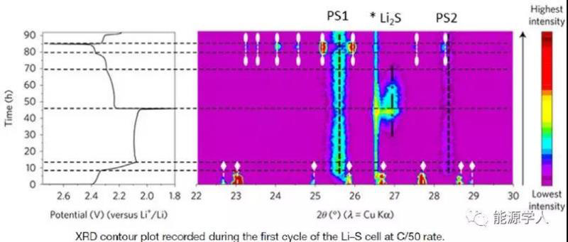 OperandoX射線衍射(XRD)是跟蹤晶體材料結(jié)構(gòu)變化的一種選擇技術(shù),在Li-S電池中,有四種可能的固相,即硫的α-和β-多晶型,放電產(chǎn)物L(fēng)i2S和Li2S2相,可以通過XRD觀察到。雖然硫正極的概念從20世紀(jì)70年代初就已經(jīng)知道了,但直到最近才發(fā)現(xiàn),首次循環(huán)之后,硫不會(huì)回到其α-多晶型,而是以β-型存在。同樣,近期人們才更多地關(guān)注鋰-硫電池放電產(chǎn)物的研究,Li2S產(chǎn)物在在低電位區(qū)域生成。至于Li2S2相,迄今為止,在標(biāo)準(zhǔn)電化學(xué)條件下還沒有用XRD進(jìn)行鑒定。幾個(gè)研究小組報(bào)告說,由于這一階段的高度不穩(wěn)定性,無法檢測到;也有報(bào)告稱Li2S2可能是高度無序的相,無法通過XRD進(jìn)行鑒定;其他研究人員認(rèn)為,Li2S2的壽命太短,任何技術(shù)都無法檢測到。直到最近,Paolella等人利用“鹽中溶劑”方法提出了Li2S2相的XRD特征,盡管其結(jié)果與大多數(shù)理論預(yù)測的空間群和晶體結(jié)構(gòu)相矛盾。