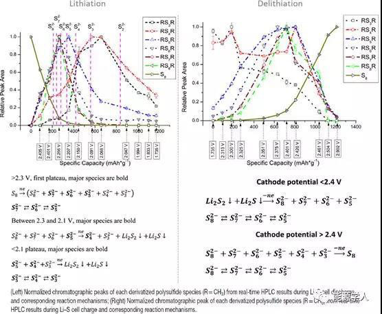 由于鋰-硫體系中的大多數(shù)反應(yīng)都發(fā)生在液相,因此在電池循環(huán)時(shí)能夠跟蹤鋰多硫化物(Li2Sn)至關(guān)重要。在這方面,Dominko和他的同事們已經(jīng)做了大量的工作,他們將Operando紫外-可見光譜技術(shù)作為追蹤和理解中間Li2Sn物態(tài)變化的可靠工具。近年來,X射線吸收近邊緣結(jié)構(gòu)研究已經(jīng)邁出了一步,使人們能夠研究重復(fù)充放電循環(huán)中硫物質(zhì)氧化狀態(tài)的演變。但這項(xiàng)技術(shù)需要同步輻射源,而且多硫化物的亞穩(wěn)態(tài)特性使得對參考樣品的測量變得困難,這對分析和結(jié)果產(chǎn)生了影響。當(dāng)需要選擇表征技術(shù)時(shí),多硫化物的介穩(wěn)性常常受到質(zhì)疑,這就解釋了高效液相色譜法(HPLC)用于分析衍生穩(wěn)定的溶解性多硫化物的原因。因此,提出了詳細(xì)的反應(yīng)機(jī)理,并闡明了每種中間體的作用(圖3)。本研究確認(rèn)了先前報(bào)告的結(jié)論,并提供了一個(gè)更加全面的表述。結(jié)果表明,高鋰化電位平臺(tái)主要?dú)w因于長鏈多硫化物,S82–、S72–、S62–之間存在一個(gè)元平衡,中鏈Li2Sn(S52–、S42之間的平衡)的電壓降對應(yīng)于長鏈的還原,低電位平臺(tái)是Li2S生成前短鏈Li2Sn(S42-和S32-之間的平衡)之間的平衡。在脫鋰過程,由于S82-、S72-、S62-和S52之間的動(dòng)態(tài)化學(xué)平衡(圖3),結(jié)果不太明顯。Saqib等人基于Operando紅外光譜的得出了類似的結(jié)論。此外,他們還發(fā)現(xiàn),聚硫化合物缺乏有序性、濃度的變化以及硫/Li2S復(fù)合困難是導(dǎo)致其長期循環(huán)性能不佳的原因。