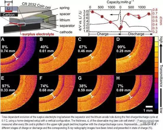 除了X射線衍射(XRD)外,透射電子顯微鏡(TEM)也經(jīng)常被用來研究鋰-硫電池在循環(huán)過程中形成的固體產(chǎn)物。但由于進(jìn)行這些測試所需的高真空條件會(huì)引起電解質(zhì)蒸發(fā),故大部分結(jié)果都是從異位樣品獲得的。當(dāng)樣品在一定的松弛時(shí)間后被檢測時(shí),不能真實(shí)地反映電池暫停時(shí)的平衡,并被認(rèn)為與其中發(fā)生的動(dòng)態(tài)過程有關(guān)。然而,盡管存在這些障礙,一些研究小組仍試圖進(jìn)行原位或Operando TEM試驗(yàn),為S8和Li2S階段的結(jié)構(gòu)完整性以及循環(huán)期間發(fā)生的體積變化提供了見解。如前所述,由于高真空環(huán)境,循環(huán)條件與標(biāo)準(zhǔn)條件非常不同。為了在鋰-硫電池中實(shí)現(xiàn)“相位捕獲”,Yang等人電化學(xué)阻抗譜和X射線照相相結(jié)合。由于特殊的Operando裝置能夠同時(shí)滿足這兩種技術(shù)的要求,他們確定了鋰電極周圍的一個(gè)環(huán),其厚度隨電荷狀態(tài)(SOC)的變化而變化(圖2)。這一觀察結(jié)果與硫化學(xué)的變化直接相關(guān),因?yàn)樵诟唠娢缓偷碗娢黄脚_(tái)的末端分別達(dá)到了極限。