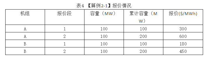 【算例2-1】兩臺(tái)機(jī)組A和B,額定容量均為200MW,各分為兩段,每段100MW,機(jī)組A的兩段報(bào)價(jià)分別為300¥/MWh和600¥/MWh,機(jī)組B的兩段報(bào)價(jià)分別為180¥/MWh和450¥/MWh。具體如表4所示。