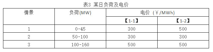 假設(shè)現(xiàn)貨市場(chǎng)中,機(jī)組G1和G2的報(bào)價(jià)均等于實(shí)際的成本。也就是說,每個(gè)電廠申報(bào)一段報(bào)價(jià),申報(bào)數(shù)量分別為100MW和60MW,申報(bào)價(jià)格分別為300¥/MWh和500¥/MWh。【算例1-1】下沒有啟停費(fèi)用,【算例1-2】下機(jī)組G1申報(bào)10萬元的啟停費(fèi)用。從分析可以知道,系統(tǒng)的實(shí)時(shí)電價(jià)與系統(tǒng)負(fù)荷的關(guān)系與圖2一致。表3給出了在不同負(fù)荷區(qū)間分別按【算例1-1】和【算例1-2】計(jì)算得到的實(shí)時(shí)電價(jià)。