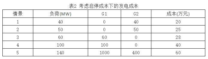 分析:當(dāng)負(fù)荷低于50MW時(shí),全部由G2發(fā)電。負(fù)荷為40MW時(shí),全部由G2發(fā)電的成本為40*500*10=200000元=20萬元。負(fù)荷為50MW時(shí),全部由G2發(fā)電的成本為50*500*10=250000元=25萬元。負(fù)荷為50MW時(shí),全部由G1發(fā)電的成本為50*300*10+100000=25萬元。負(fù)荷高于50MW以后,G1發(fā)電的總成本低于G2,由于G2沒有啟停成本,如果負(fù)荷在50MW-100MW之間,全部由G1發(fā)電。負(fù)荷大于100MW以后,再重新讓G2發(fā)電。
