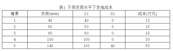 【算例1-1】如果有兩臺(tái)機(jī)組G1和G2,單位發(fā)電成本分別為300¥/MWh和500¥/MWh,G1和G2的額定容量(最大發(fā)電容量)分別為100MW和60MW。設(shè)負(fù)荷每天連續(xù)持續(xù)10小時(shí)(8:00-18:00期間),負(fù)荷水平如表1所示,其余時(shí)間負(fù)荷為零。計(jì)算在不同負(fù)荷水平下每天的發(fā)電成本。