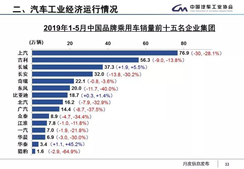 從中國品牌乘用車銷量來看,排名前十五位的車企當(dāng)中僅有3家在1~5月實(shí)現(xiàn)銷量的增長,其余均有不同程度的下降。上漲的企業(yè)與4月時相同,依舊是長城、比亞迪和華泰。這三家車企的漲幅分別為5.5%、1.4%和45.2%。而在下降的車企中,降幅最大的是獵豹,達(dá)64.9%。