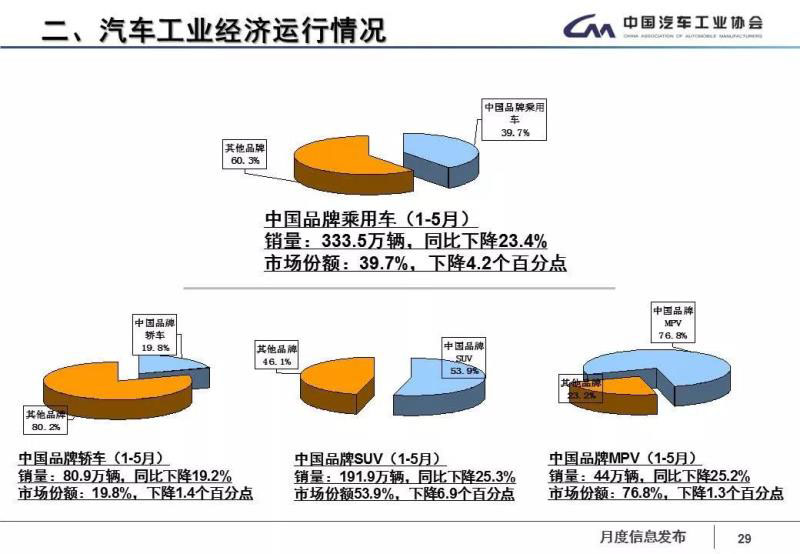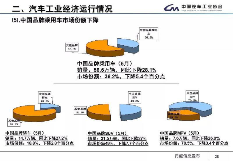 在今年4月份,中國品牌乘用車市場份額已經(jīng)降到2017年以來的最低值。到了5月份,中國品牌乘用車市場份額依舊在降低。
