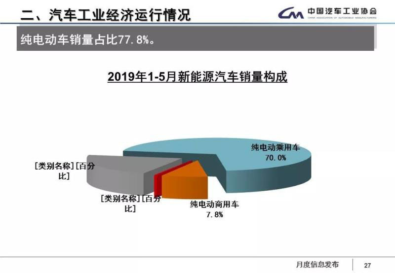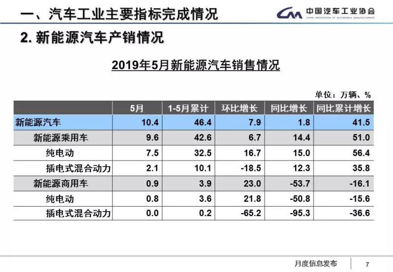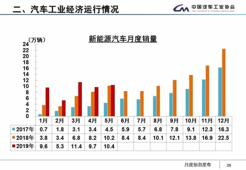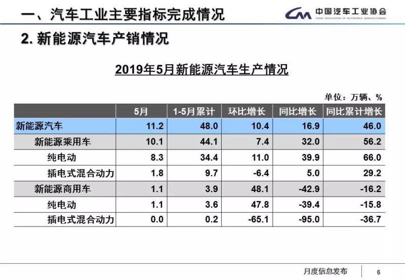 和往常一樣,新能源汽車的增長情況依舊是一枝獨(dú)秀,但5月份新能源汽車的增長速度已經(jīng)出現(xiàn)放緩態(tài)勢。在信息發(fā)布會上,記者了解到,下半年,隨著符合國六標(biāo)準(zhǔn)的車型不斷增加,以及減稅降費(fèi)等一系列政策措施效果的持續(xù)顯現(xiàn),特別是6月初國家發(fā)展改革委、生態(tài)環(huán)境部、商務(wù)部聯(lián)合公布《關(guān)于印發(fā)<推動重點(diǎn)消費(fèi)品更新升級 暢通資源循環(huán)利用實(shí)施方案(2019-2020年)>的通知》,為乘用車市場帶來相對積極的作用,新能源汽車產(chǎn)銷有望繼續(xù)保持較快增長。