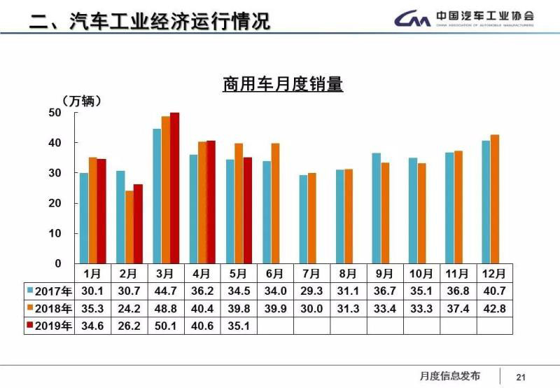 值得注意的是,商用車的銷量也結(jié)束增長,呈現(xiàn)小幅下降。5月商用車生產(chǎn)35.70萬輛,環(huán)比下降8.83%,同比下降8.50%;銷售35.14萬輛,環(huán)比下降13.37%,同比下降11.79%。1-5月,商用車產(chǎn)銷分別為185.76萬輛和186.72萬輛,產(chǎn)量同比增長0.67%,銷量同比下降1.30%。