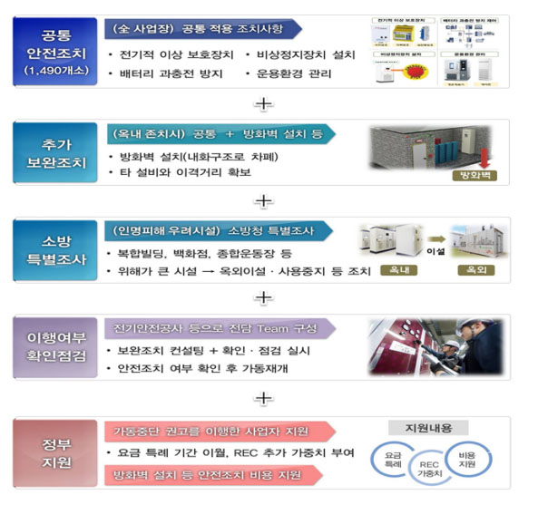 2018年5月份開始火災(zāi)事故頻頻發(fā)生,產(chǎn)業(yè)部在優(yōu)先考慮國民安全的前提下,采取了現(xiàn)場(chǎng)實(shí)時(shí)調(diào)查,安全診斷,ESS設(shè)備全面停止等多方位的相應(yīng)措施。