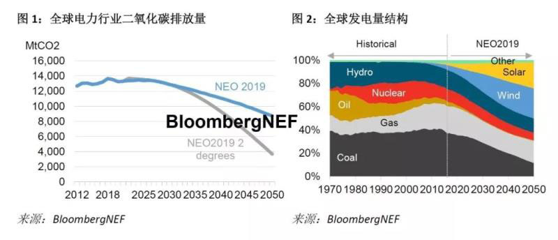 根據(jù)彭博新能源財(cái)經(jīng)(BloombergNEF)的最新分析,由于風(fēng)電、太陽(yáng)能和儲(chǔ)能技術(shù)成本的大幅下降,到2050年全球近一半的電力將由這兩種快速發(fā)展的可再生能源供給。BNEF在2019年《新能源市場(chǎng)長(zhǎng)期展望》(New Energy Outlook 2019,NEO)報(bào)告中預(yù)計(jì),這些技術(shù)將確保電力部門在2030年前為保持全球溫升不超過2度做出應(yīng)有貢獻(xiàn)。(世界經(jīng)濟(jì)的其他行業(yè)也需要在脫碳方面取得重大進(jìn)展,以應(yīng)對(duì)氣候變化。)