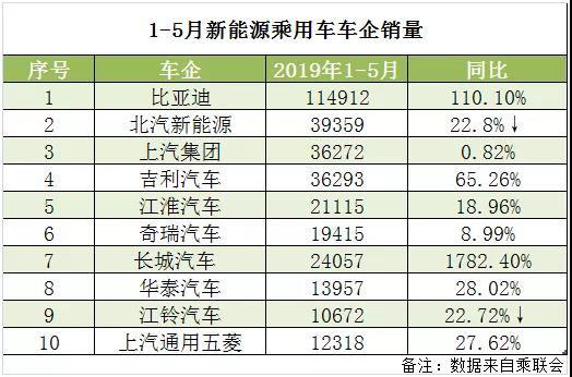 從2019年前5月銷量TOP10 企業(yè)來看,2019年新能源汽車整體銷量放緩,除長城汽車、比亞迪、吉利汽車3家出現(xiàn)了超5成的增速外,其余企業(yè)均維持在20%的增速,其中北汽新能源、江鈴汽車出現(xiàn)了超2成的降幅。