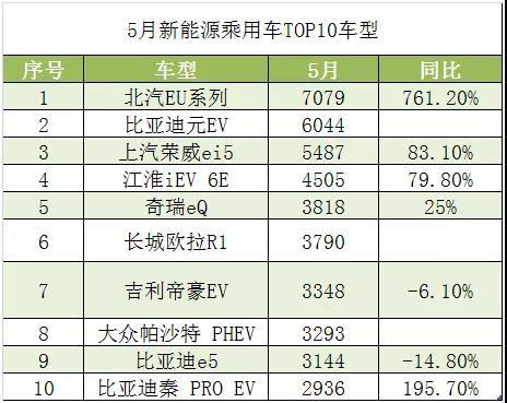 5月國內(nèi)新能源乘用車銷售9.7萬輛,環(huán)比微增5.8%,同比增長5.4%。增速明顯放緩,但相對于傳統(tǒng)乘用車17%的負增速,新能源車表現(xiàn)依然算強勁。其中銷量TOP 10企業(yè)累計銷售了7.23萬輛,占當月新能源乘用車總銷量的74.5%,占比超7成。