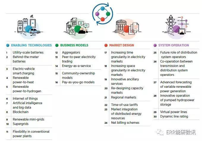 正如國際可再生能源署的工作所證實的,沒有一個單一能改變游戲規(guī)則的創(chuàng)新。任何孤立的創(chuàng)新都不可能產(chǎn)生重大影響,而是需要伴隨著電力所屬部門的創(chuàng)新。國際可再生能源署調(diào)查了大量創(chuàng)新的前景,這些創(chuàng)新可促進將高份額間歇性可再生能源融入到電力系統(tǒng)中,確定并集合了30項變革性創(chuàng)新,包括支持技術(shù)、業(yè)務(wù)模型、市場設(shè)計和系統(tǒng)操作。
