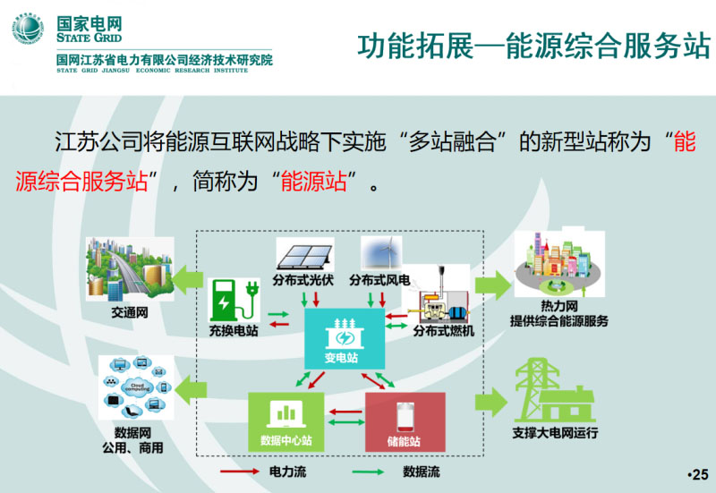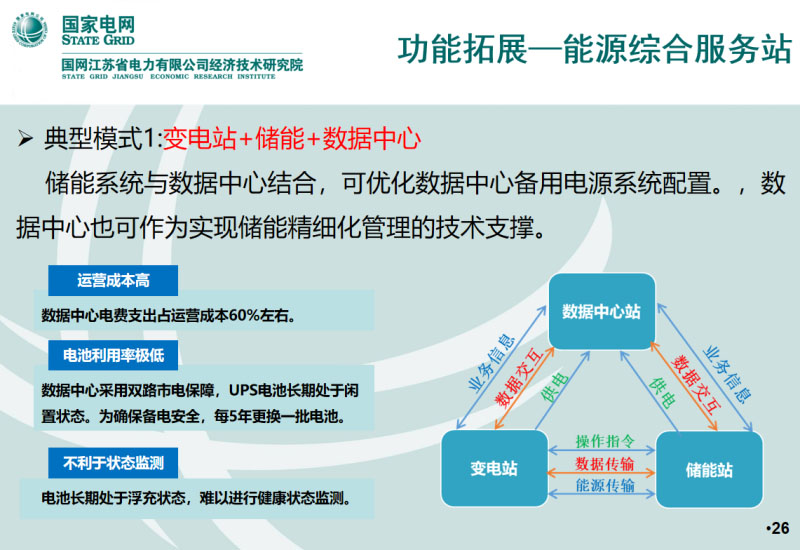 我們現(xiàn)在正在做的另外一個(gè)研究是關(guān)于三站合一的,2019年國網(wǎng)公司提出了三站合一的研究,江蘇公司將能源互聯(lián)網(wǎng)戰(zhàn)略實(shí)施“多站融合”的新型站稱為能源綜合服務(wù)站,簡稱為能源站。如果用了儲能的話,相當(dāng)于可以考慮用儲能來替代UPS的電池。