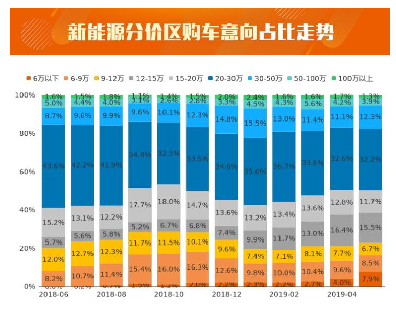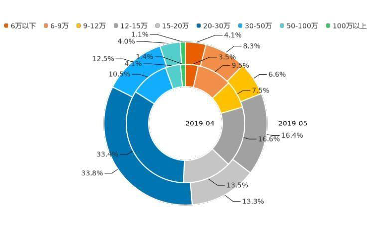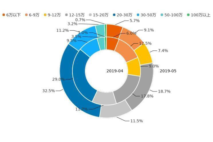 價(jià)格是用戶購車時(shí)最主要的考慮因素之一,那么用戶對(duì)不同價(jià)位車型的意向度究竟如何,一起來了解!今年5月,12萬以下價(jià)區(qū)用戶購車意向占比為3.1%,相較上月增加1.8個(gè)百分點(diǎn);12-20萬價(jià)區(qū)用戶購車意向占比達(dá)27.2%,對(duì)比上月下滑2.0%;20-30萬為用戶關(guān)注的主力價(jià)區(qū),用戶購車意向占比為32.2%,相較上月下滑0.4%;30-50萬價(jià)區(qū)用戶購車意向占比為12.3%,比上月增加1.2個(gè)百分點(diǎn);50萬以上價(jià)區(qū)用戶購車意向占比為5.2%,較上月下滑0.7%。通過分析近12個(gè)月的用戶購車意向數(shù)據(jù)發(fā)現(xiàn),2018年06月至今年5月,12萬以下價(jià)區(qū)用戶購車意向占比增加2.9個(gè)百分點(diǎn),低價(jià)市場有所升溫;12-20萬價(jià)區(qū)用戶購車意向占比上漲6.3%,份額保持大幅增長;20萬以上價(jià)區(qū)用戶購車意向占比,下跌9.2個(gè)百分點(diǎn),其中,20-30萬價(jià)區(qū)用戶購車意向占比下滑明顯,近12個(gè)月下跌11.4%。未來,隨著新能源車型的布局更全面,市場將進(jìn)一步細(xì)分,價(jià)區(qū)覆蓋也會(huì)更加均勻。