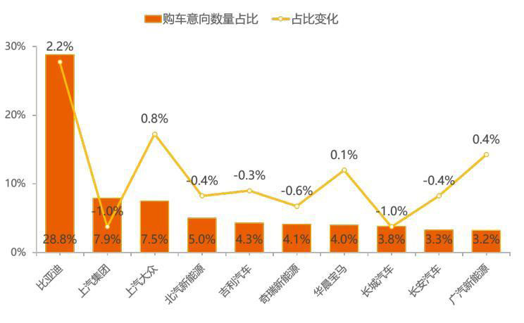 在日趨激烈的市場競爭中,各車企對(duì)于用戶的爭奪也是愈演愈烈。縱觀5月市場,Top 10廠商用戶購車意向占比累計(jì)達(dá)71.9%,相較上月份額下滑0.2個(gè)百分點(diǎn),市場區(qū)域集中度有所下降。十個(gè)廠商中,有4個(gè)廠商用戶購車意向占比實(shí)現(xiàn)上漲,增幅最大的廠商為比亞迪,以2.2%的增幅領(lǐng)漲Top 10廠商;跌幅最大的廠商為上汽集團(tuán),下降比例為1.0%。合資品牌廠商僅有上汽大眾、華晨寶馬躋身Top 10榜單,用戶購車意向占比分別為7.5%、4.0%。比亞迪為用戶最為青睞的廠商,用戶購車意向占比為28.8%,大幅領(lǐng)先于其他廠商,榜首地位穩(wěn)固。
