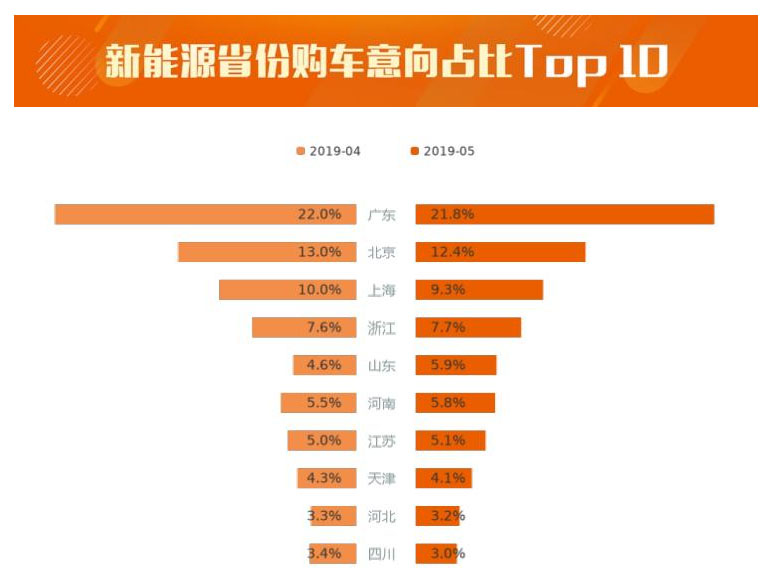 2019年5月,用戶購車意向占比最高的5個(gè)省份包括廣東、北京、上海、浙江、山東,廣東以21.8%的用戶購車意向占比獨(dú)居鰲頭,大幅甩開其他省份。線索量Top 10省份用戶購車意向占比累計(jì)達(dá)78.3%,相較上月降低0.4個(gè)百分點(diǎn),市場區(qū)域集中度有所下降。全部省份中有13個(gè)省份用戶購車意向占比有所增加,而11個(gè)省份的用戶購車意向占比出現(xiàn)下滑,其中,山東、河南、安徽相較上月購車意向占比分別增加1.3%、0.3%、0.2%,為增長最高的3個(gè)省份;上海、北京、四川用戶購車意向占比分別減少0.7%、0.6%、0.4%,為下降最多的3個(gè)省份。