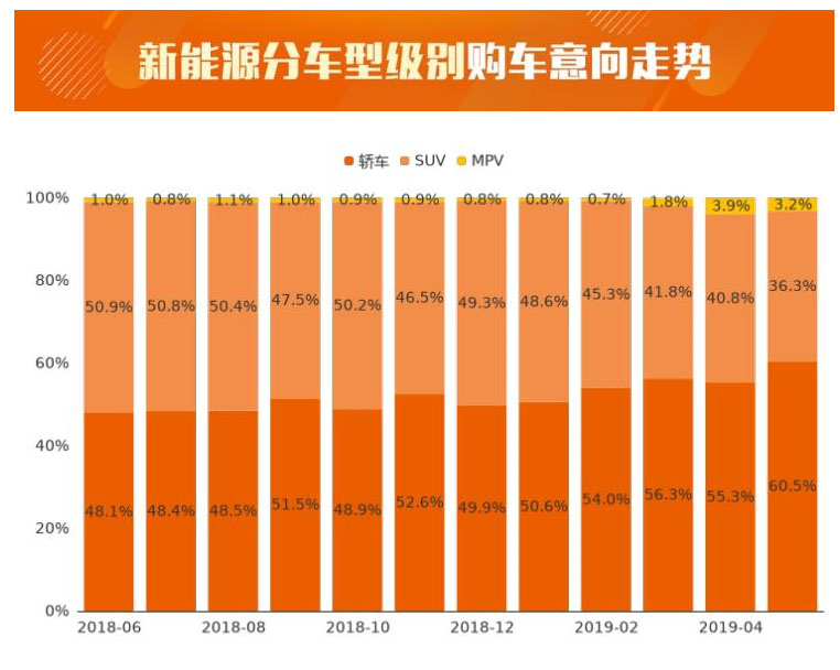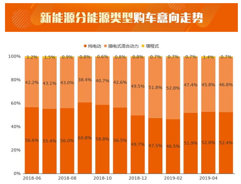 2019年5月,新能源車中純電動(dòng)車型用戶購車意向數(shù)量占比為52.4%,相較上月小幅下跌0.4個(gè)百分點(diǎn),購車意向占比見頂回落;插電式混合動(dòng)力車型用戶購車意向占比為46.8%,與上月相比小幅上漲1.0個(gè)百分點(diǎn),用戶購車意向占比經(jīng)歷連續(xù)下滑后開始反彈;增程式車型用戶購車意向占比僅為0.7%。整體來看,插電式混合動(dòng)力車型用戶購車意向數(shù)量迎來了持續(xù)擴(kuò)張,它可以享受新能源的優(yōu)惠政策,又不像純電動(dòng)車型一般具有里程焦慮、充電困難等瓶頸。同時(shí),隨著產(chǎn)品技術(shù)的提升,插電式混動(dòng)車型的成本也有了較好的控制。隨著新能源車補(bǔ)貼逐漸退坡直至退出,新能源市場由政策驅(qū)動(dòng)向市場驅(qū)動(dòng)變軌后,插電式混動(dòng)車型或會(huì)強(qiáng)化在私人領(lǐng)域的優(yōu)勢(shì)。