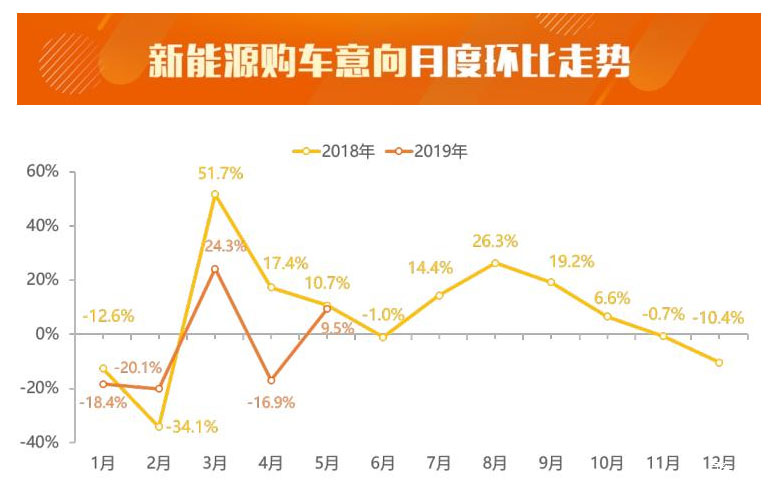 首先,我們來看一下新能源汽車整體走勢(shì)如何。5月,新能源車用戶購車意向數(shù)量環(huán)比增長9.5%,相較上月環(huán)比增長率提高26.4個(gè)百分點(diǎn),用戶購車意向經(jīng)歷下滑后,開始回升。汽車市場具有明顯的季節(jié)性和周期性,我們將今年的購車意向數(shù)據(jù)與上一年的數(shù)據(jù)對(duì)比來看,今年5月與上一年同期相比,上漲走勢(shì)有所放緩。去年3至5月環(huán)比均為增長走勢(shì),但增幅逐月縮窄;今年4月份,受補(bǔ)貼退坡影響,用戶購車意向環(huán)比大幅下滑,而隨著政策過渡期的即將結(jié)束及廠商促銷政策的推出,5月份購車熱度開始反彈。
