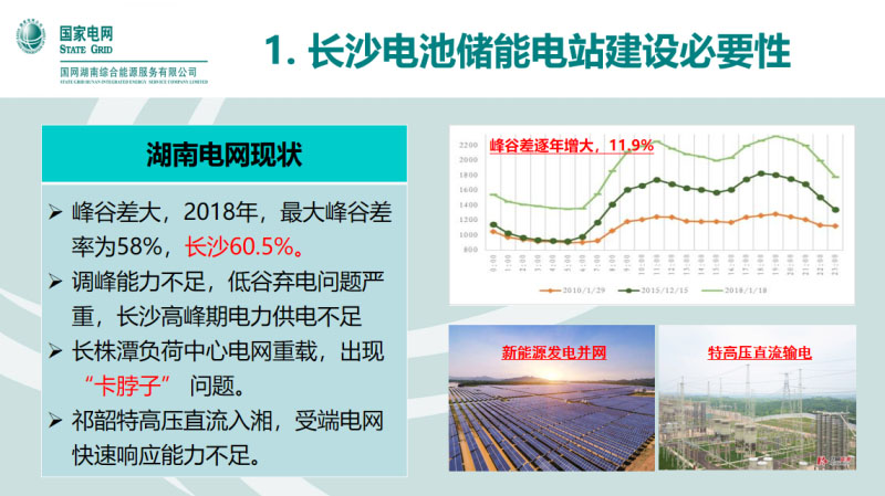 長沙電池儲(chǔ)能電站建設(shè)的必要性基于湖南電網(wǎng)現(xiàn)在的情況。湖南電網(wǎng)人均裝機(jī)量只有全國平均水平的一半,它的調(diào)峰能力比較差,抽水蓄能占比低。在2018年,湖南的最大峰谷差達(dá)到58%,長沙達(dá)到60.5%。而隨著用電量的持續(xù)增長,峰谷差持續(xù)增大,每年增長達(dá)到11.9%。而隨著光伏和風(fēng)電的持續(xù)快速發(fā)展,間歇性并網(wǎng)導(dǎo)致湖南電網(wǎng)的穩(wěn)定性難度增加。2017年,祁韶特高壓直流入湘,導(dǎo)致了受端快速響應(yīng)的不足?;谶@些問題,湖南電網(wǎng)在2018年建立了長沙電池儲(chǔ)能電站。長沙儲(chǔ)能電站建設(shè)的意義在于儲(chǔ)能電站,能夠滿足現(xiàn)在湖南電網(wǎng)調(diào)峰的需求,具有調(diào)峰調(diào)頻功能,從而提升電網(wǎng)的穩(wěn)定性和靈活性。長沙電網(wǎng)側(cè)儲(chǔ)能電站主要是響應(yīng)了國網(wǎng)三型兩網(wǎng)的建設(shè),同時(shí)把它作為一個(gè)示范性的工程,從而促進(jìn)“電網(wǎng)側(cè)示范引導(dǎo)、用戶側(cè)主體發(fā)展,電源側(cè)協(xié)同推進(jìn)”。